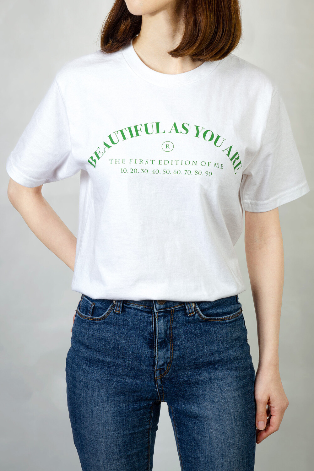 오래의 브랜드 슬로건 [Beautiful as you are] 레터링을 사용한 베이직 티셔츠입니다.
